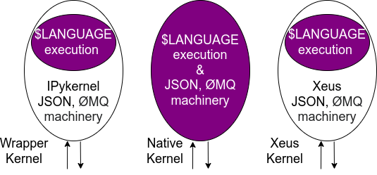 對於具有良好 Python 包裝器的語言,如 octave_kernel,或者難以實現通訊機制的語言,如 bash_kernel,包裝器核心更容易快速編寫。原生核心可能由使用它們的社群更好地維護,如 IJulia 或 IHaskell。當語言直譯器提供 C++ 或 C API 時,xeus 核心很容易編寫。